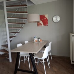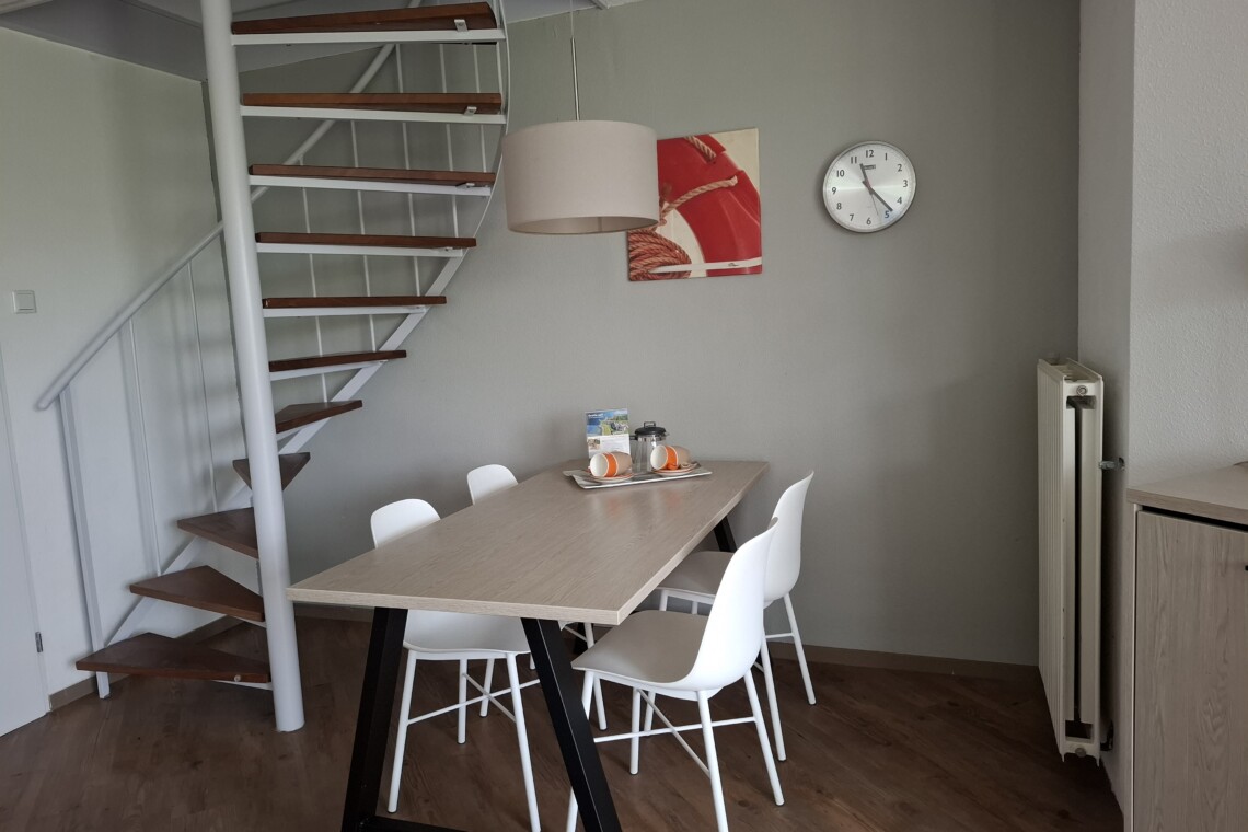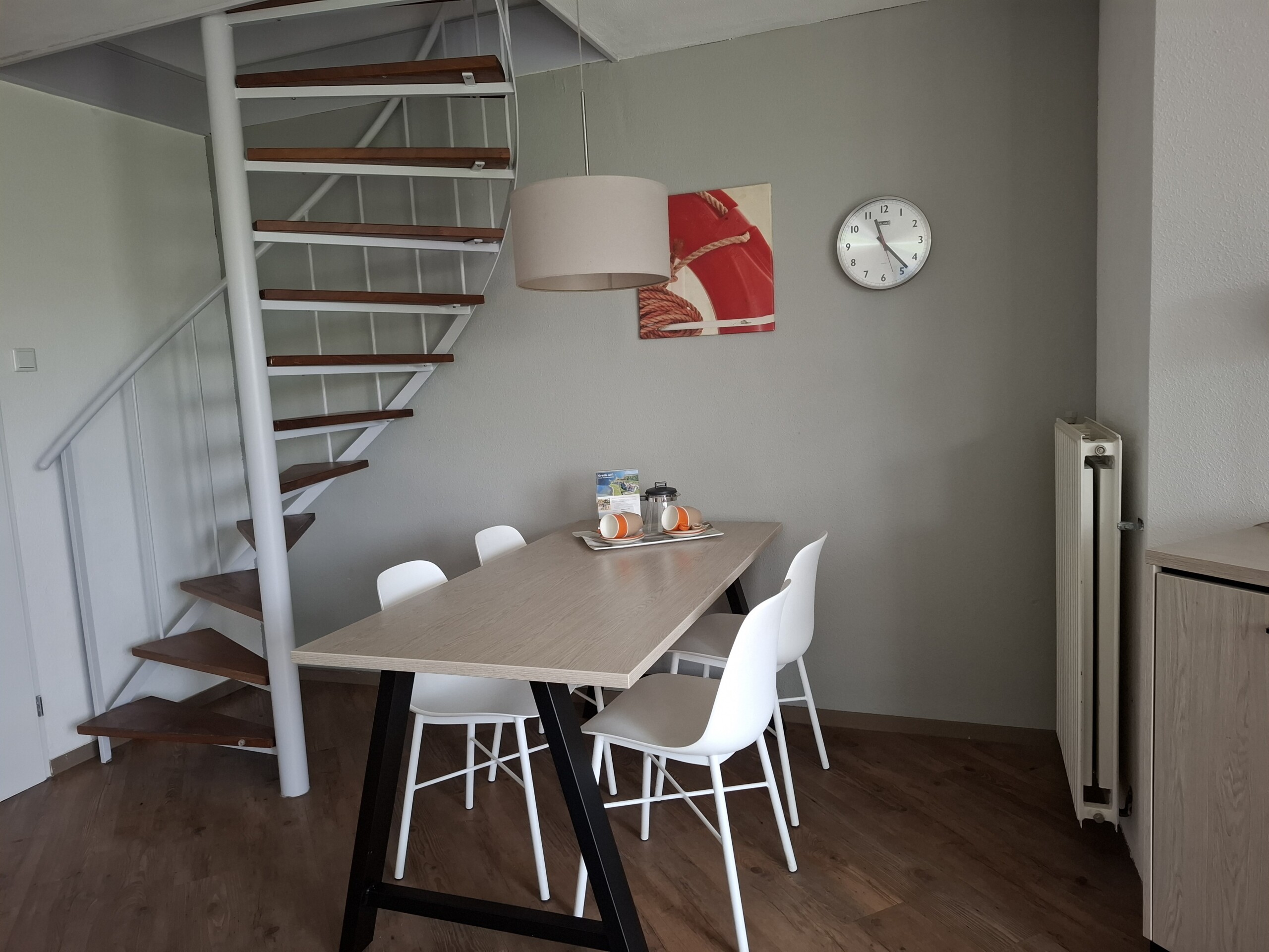 - hal, douche/toilet, woonkamer met een open keuken met vaatwasser, koelkast, Senseo, waterkoker.